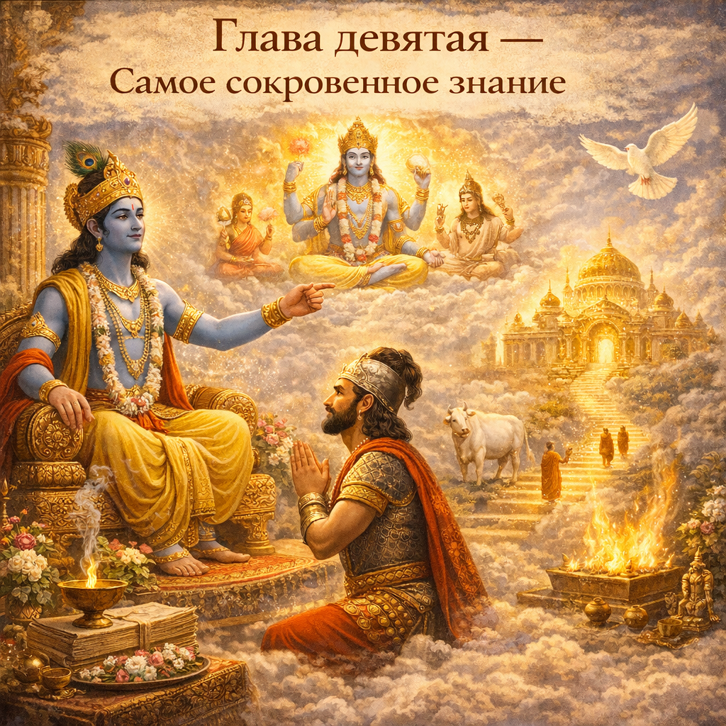 В девятой главе Кришна раскрывает самое сокровенное знание о преданном служении. Он объясняет Свою всепроникающую природу, милость к преданным и то, как искренняя любовь и посвящение всех действий Господу приводят человека к освобождению и вечному общению с Ним.