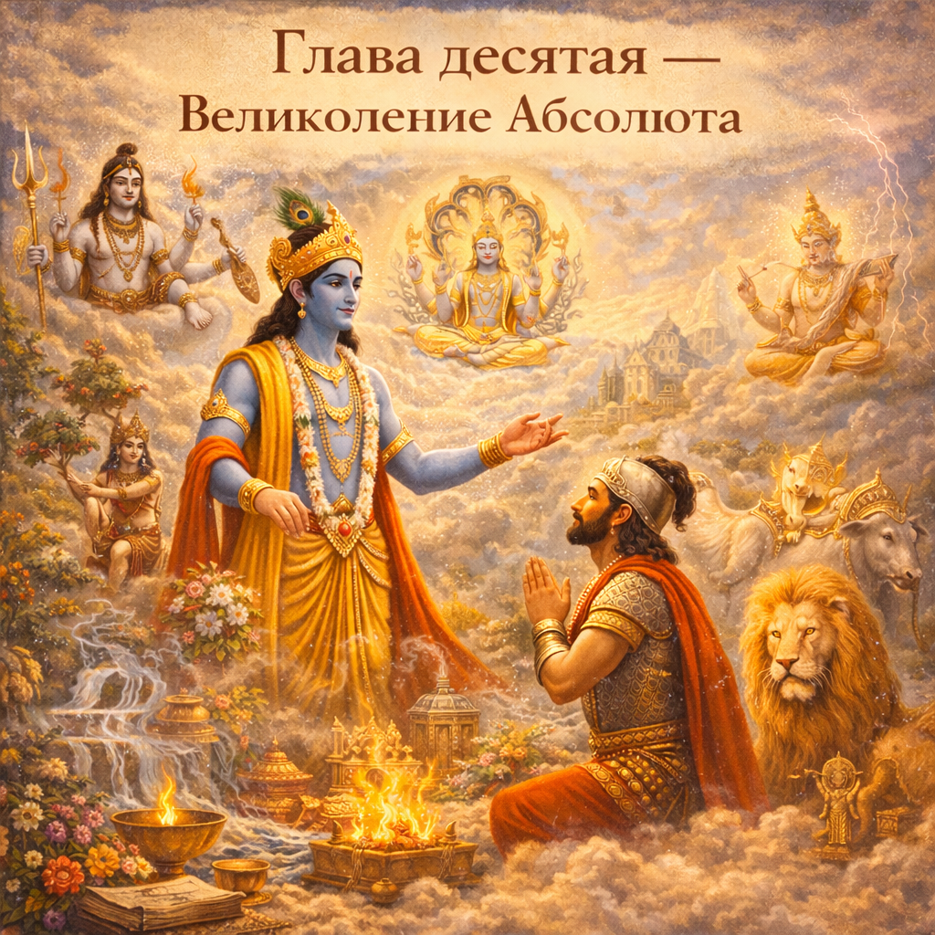 В десятой главе Кришна раскрывает Свое божественное великолепие, показывая, как все величественное, могущественное и прекрасное в мире является проявлением Его энергии. Он объясняет, что Абсолют присутствует во всем сущем и поддерживает вселенную, а истинное понимание этого рождает глубокую преданность и любовь к Богу.