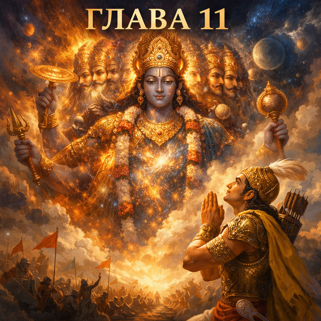 В этой главе описывается видение Арджуной вселенской формы, раскрывающей масштаб мироздания, взаимосвязь жизни и времени, а также место человека в общем устройстве вселенной. Текст передаёт философское осмысление силы, ответственности и предназначения.