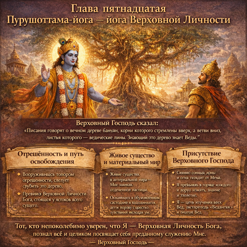 Глава пятнадцатая раскрывает природу материального и духовного мира, объясняет положение живого существа, его связь с чувствами и сознанием, а также указывает путь освобождения через отрешённость и осознание Верховной Личности.