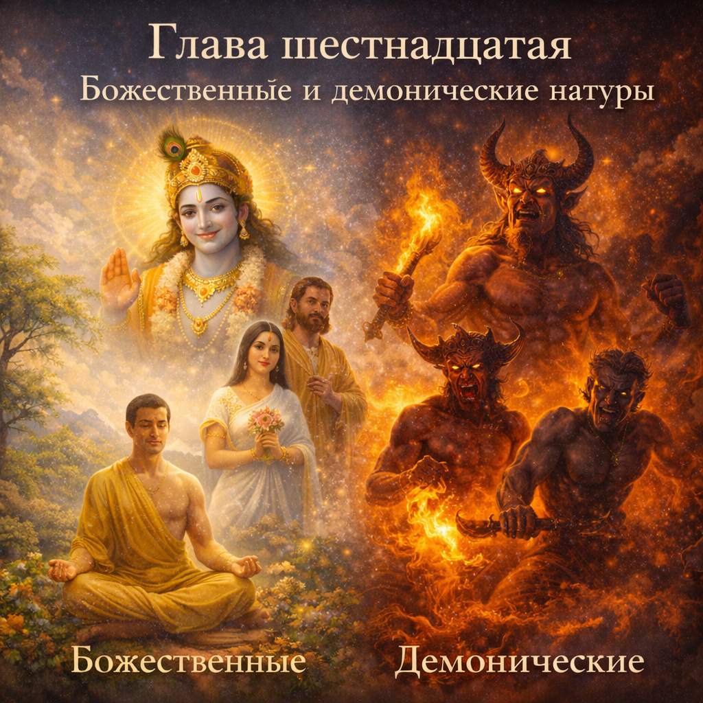 Глава шестнадцатая описывает божественные и демонические качества человека, их влияние на поведение и судьбу, а также указывает путь духовного роста через следование священным писаниям.