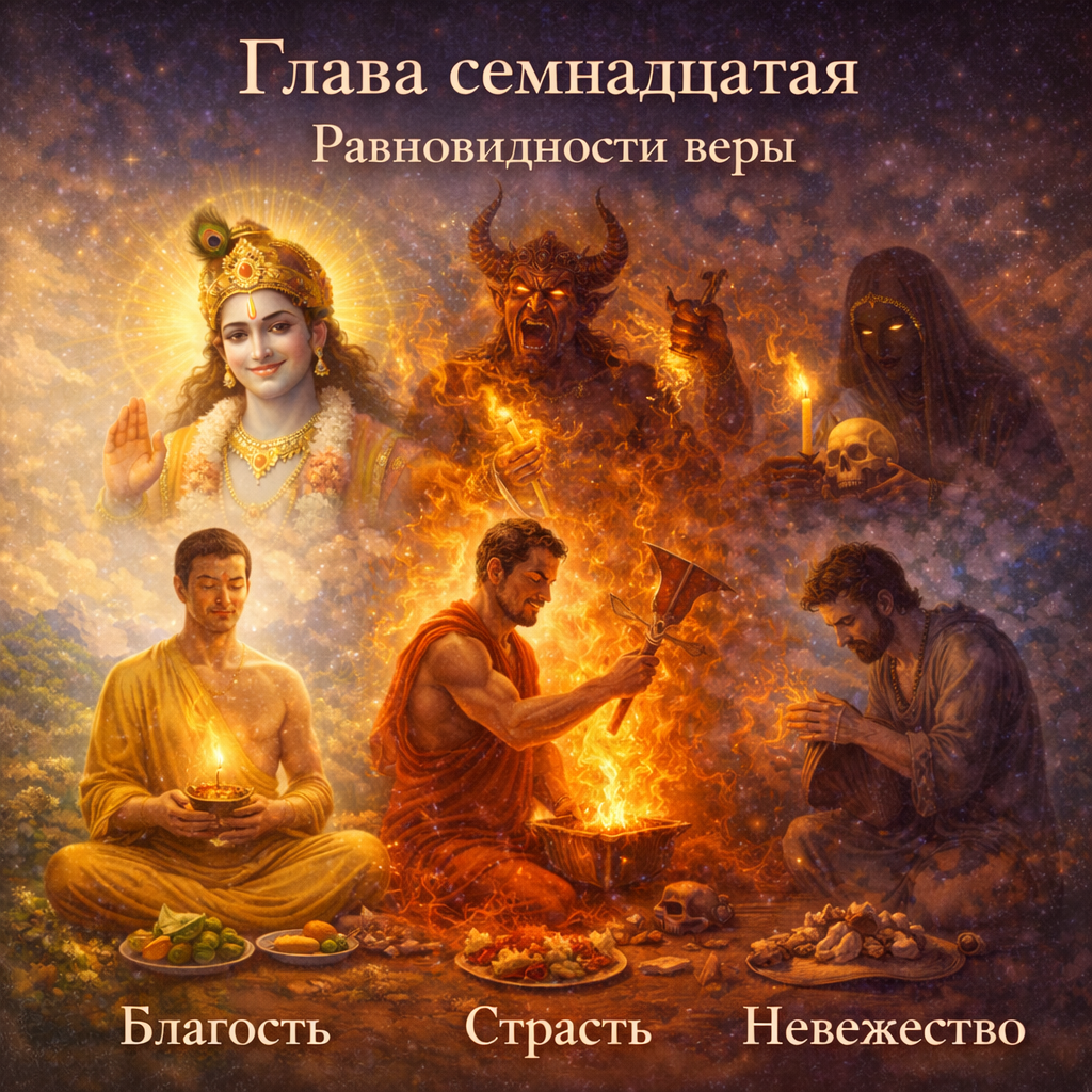 Глава семнадцатая раскрывает разные виды веры, их связь с гунами материальной природы и объясняет, как пища, поступки, аскеза и намерения формируют сознание человека.